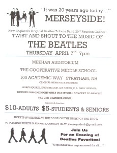 On February 28, Les emailed the others to say that he’d received an enthusiastic and positive reply from Jeff Landrock to do the “sound” for the concert. Jeff was well known to all the members of Merseyside, mostly as singer/guitarist/keyboard player for the Beatles tribute band All Together Now. Jeff told Les that he and Ace Bailey, drummer for All Together Now, would bring the band’s entire sound sysytem and do the whole deal: an afternoon sound check/rehearsal and the evening concert on April 7.