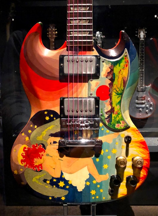 The decidedly psychedelic designs were created and applied to the SG‘s mahogany body using “oil-based enamel paint” by Marijke Koger and Simon Posthuma in London in 1967.