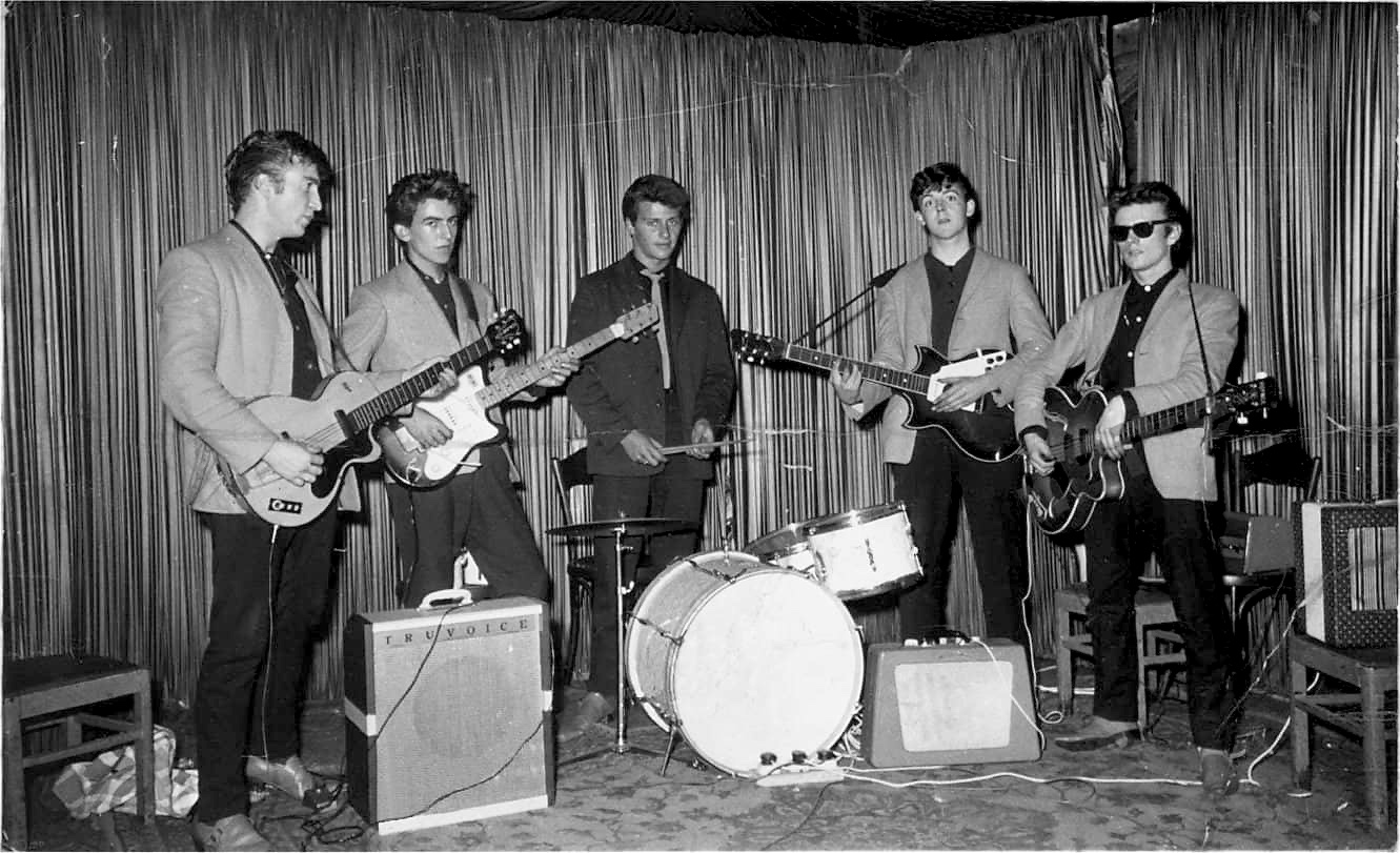 Here’s a photo of the Fab Five taken on August 17, 1960, at the Indra Club in Hamburg, Germany. (L-R: John, George, Pete, Paul & Stuart)