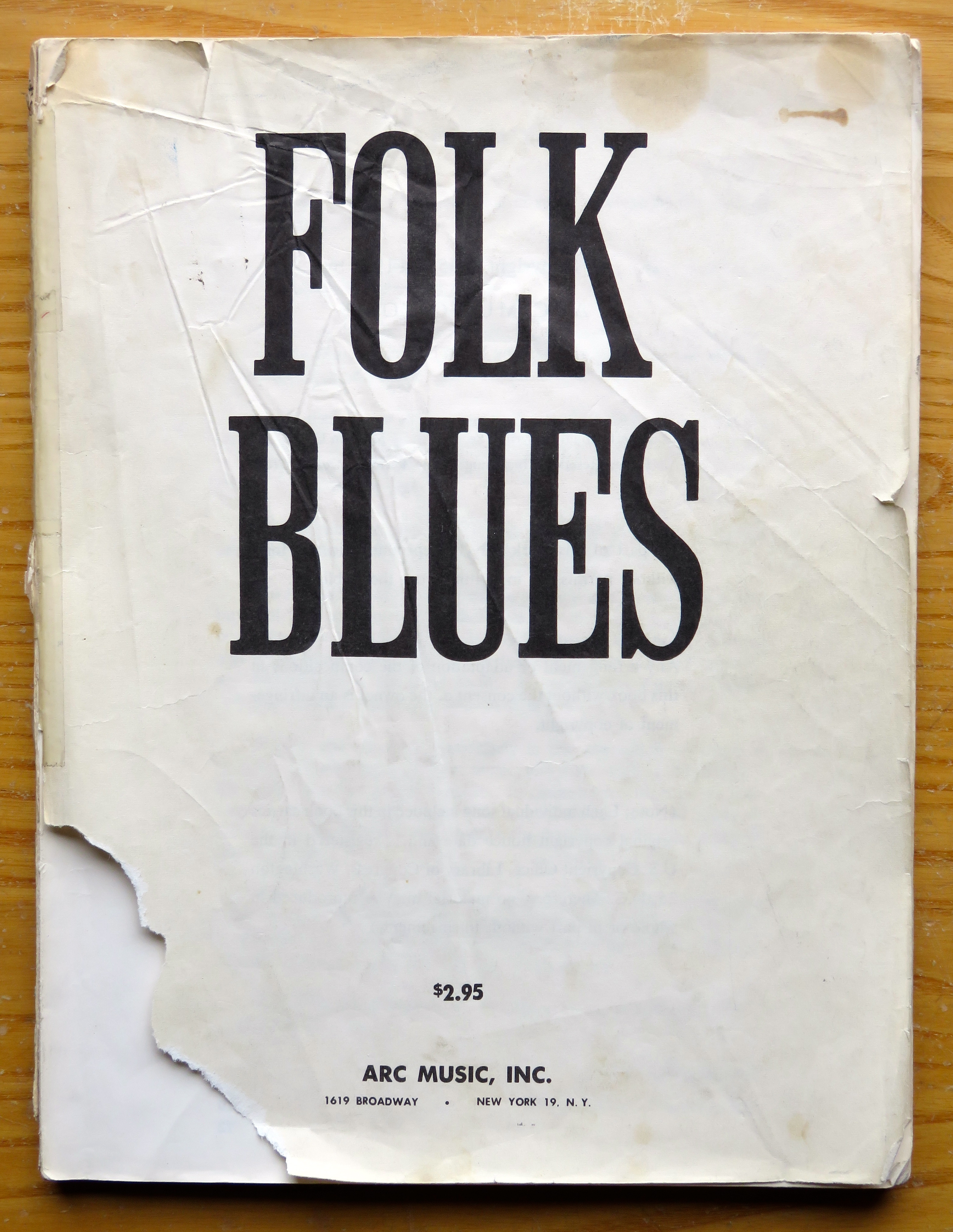 This 9″ x 11 & 3/4″ paperback volume – it did have a cover at one time – was published by ARC Music, Inc. in New York, NY and bears a copyright dated 1965 and 1969. In the foreword, Paul Ackerman, a music editor for Billboard magazine, wrote: “It is the intent of this collection of songs to illustrate the blues in their infinite variety.”